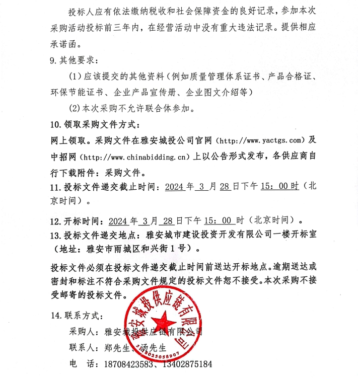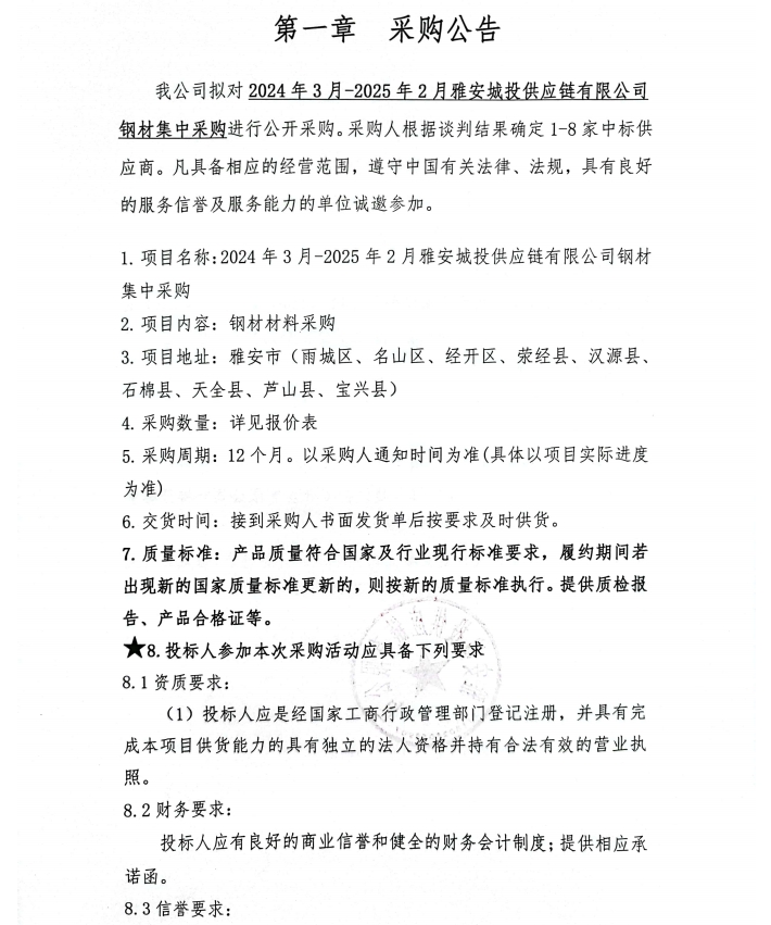 2024年3月-2025年2月雅安城投供應(yīng)鏈有限公司鋼材集中采購公告
