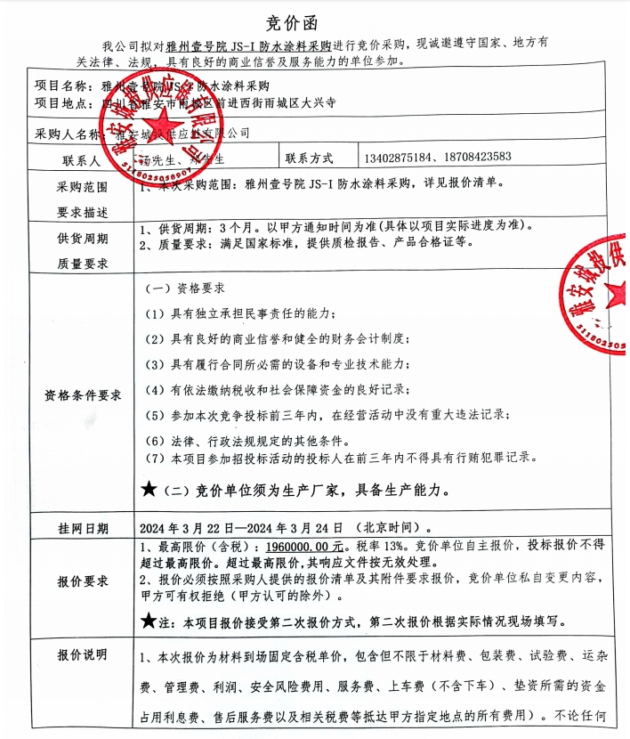 雅州壹號院JS-I防水涂料采購競價(jià)公告