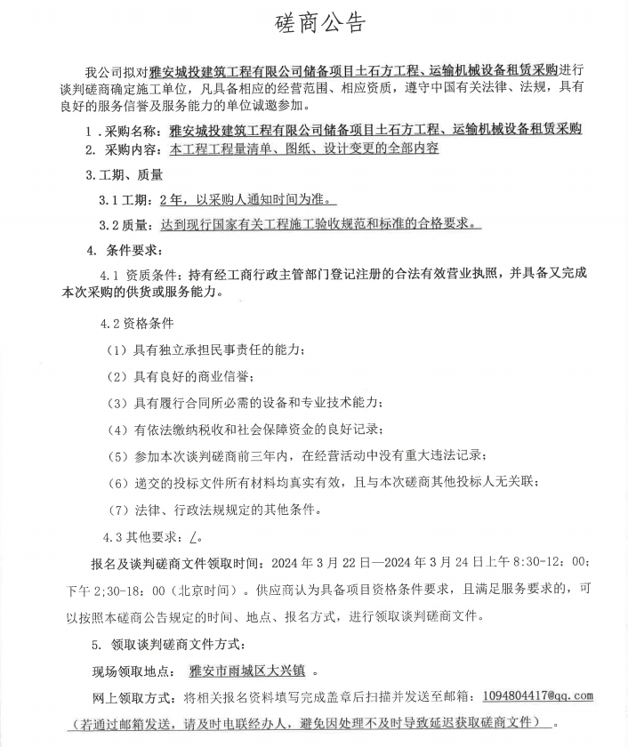 雅安城投建筑工程有限公司儲備項目土石工程、運輸機械設備租賃采購磋商公告