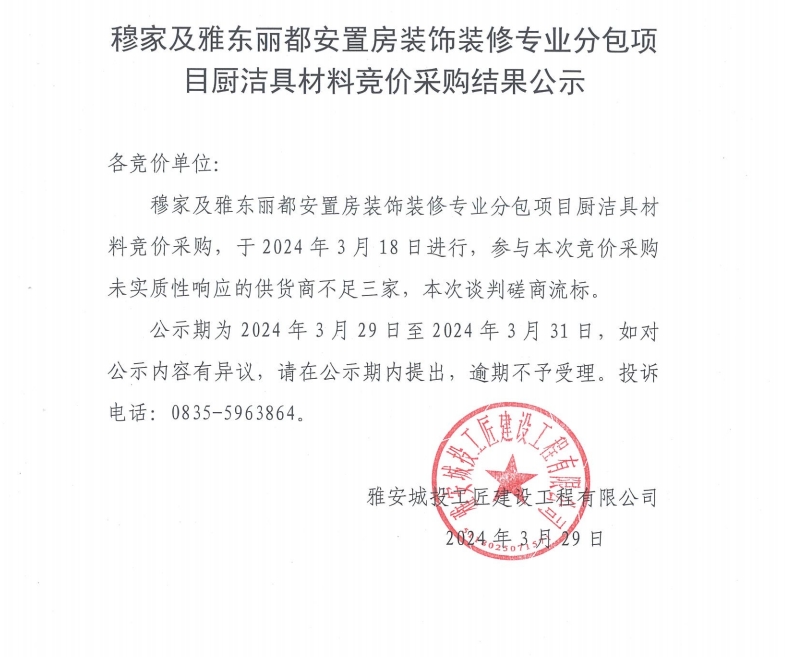 穆家及雅東麗都安置房裝飾裝修專業(yè)分包項(xiàng)目廚潔具材料競(jìng)價(jià)采購(gòu)結(jié)果公示
