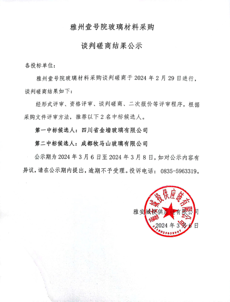 雅州壹號(hào)院玻璃材料采購(gòu)談判磋商結(jié)果公示
