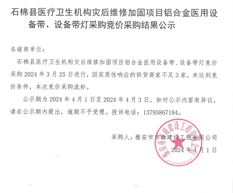 石棉縣醫(yī)療衛(wèi)生機構(gòu)災后維修加固項目鋁合金醫(yī)用設(shè)備帶、設(shè)備帶燈采購競價采購結(jié)果公示