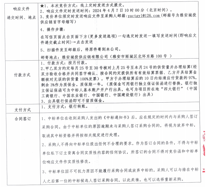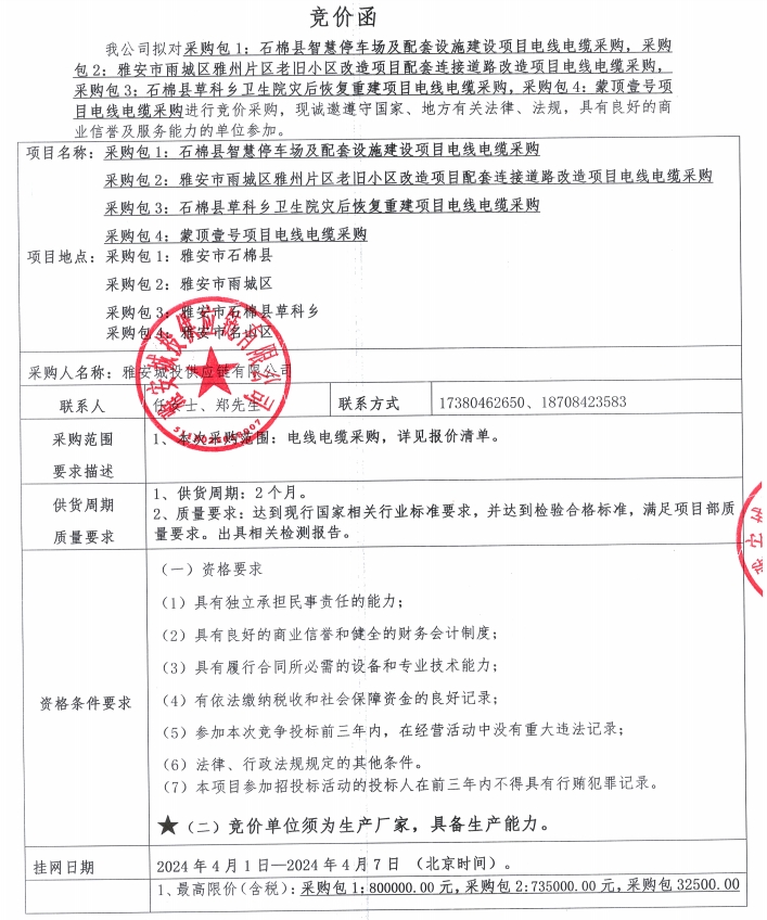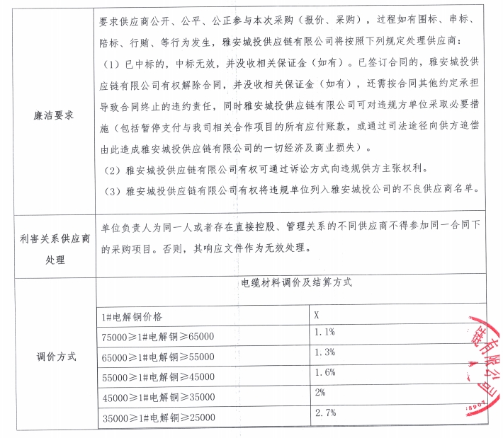 雅安城投供應鏈有限公司電線電纜采購競價公告