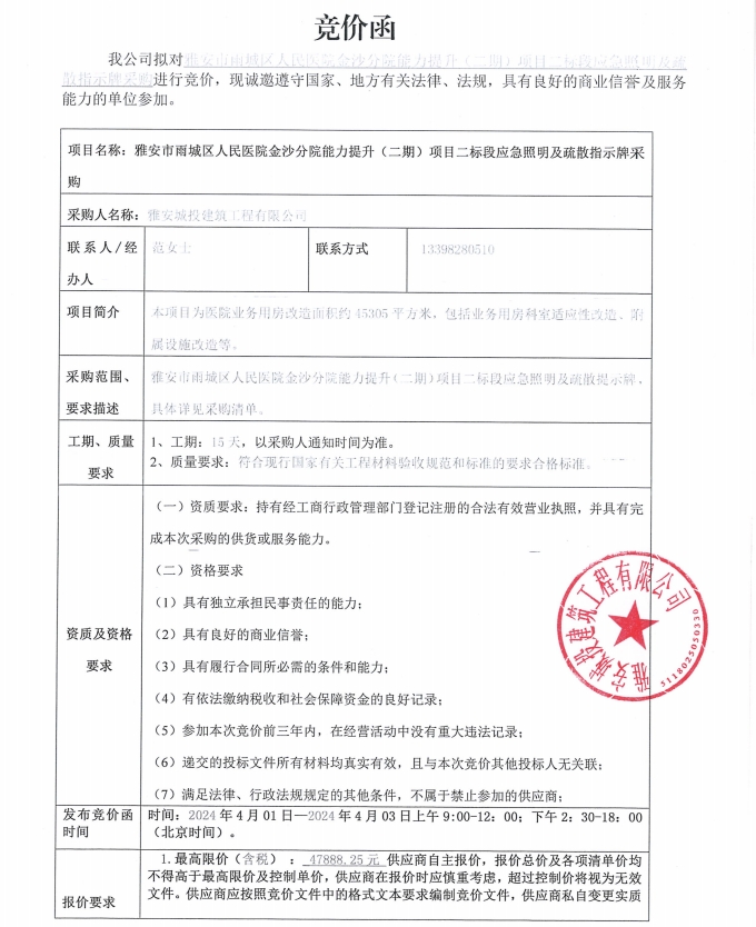 雅安市雨城區(qū)人民醫(yī)院金沙分院能力提升(二期)項目二標(biāo)段應(yīng)急照明及疏散指示牌采購競價公告
