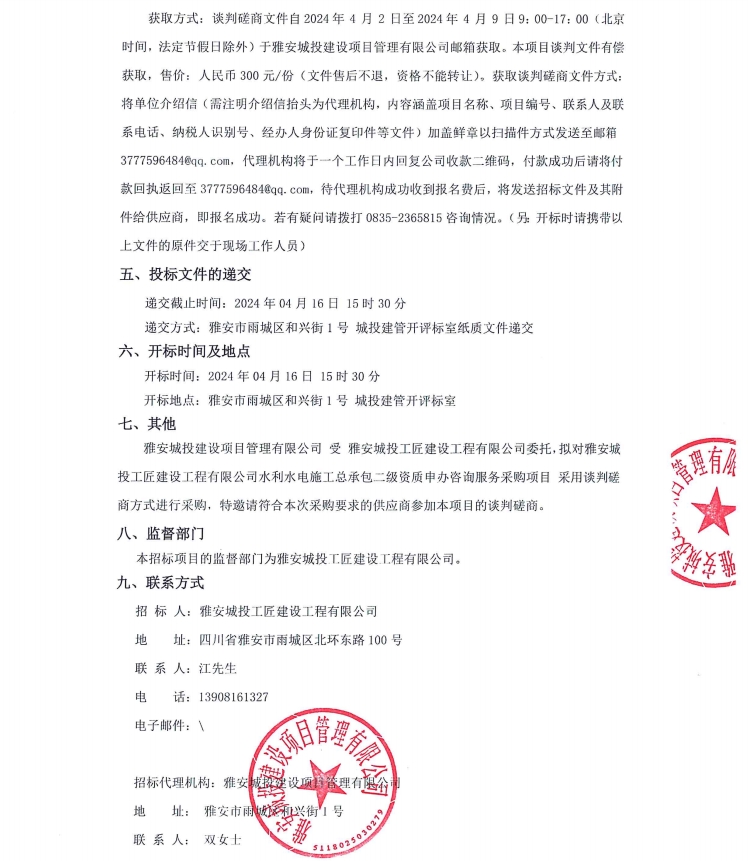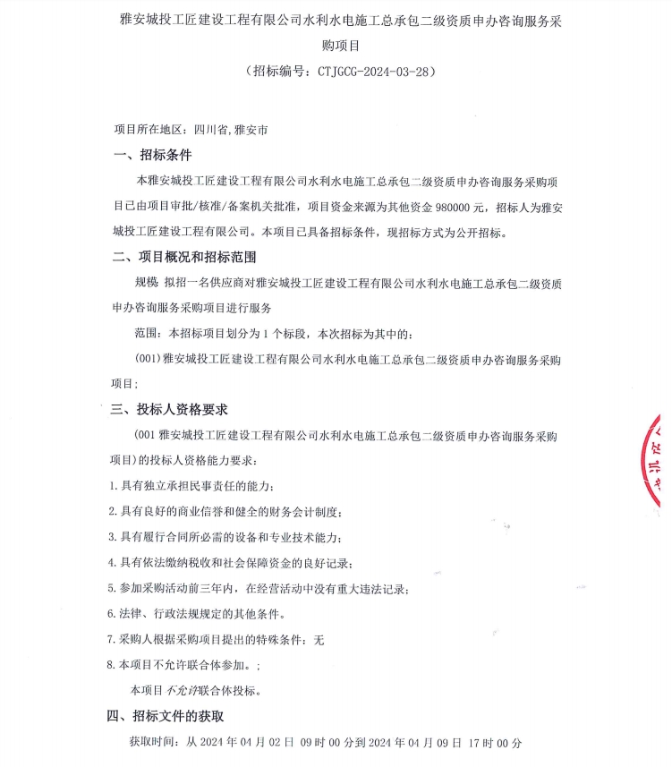 雅安城投工匠建設(shè)工程有限公司水利水電施工總承包二級(jí)資質(zhì)申辦咨詢服務(wù)采購項(xiàng)目公告