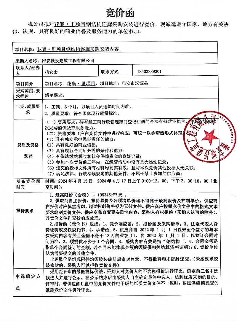 花襄·里項(xiàng)目鋼結(jié)構(gòu)連廊采購(gòu)安裝競(jìng)價(jià)公告
