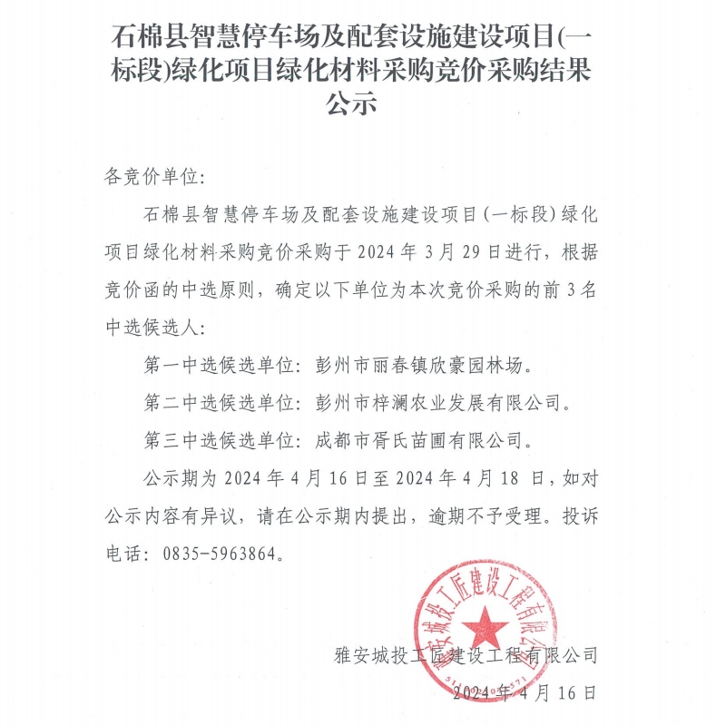 石棉縣智慧停車場及配套設(shè)施建設(shè)項目(一標段)綠化項目綠化材料采購競價采購結(jié)果公示