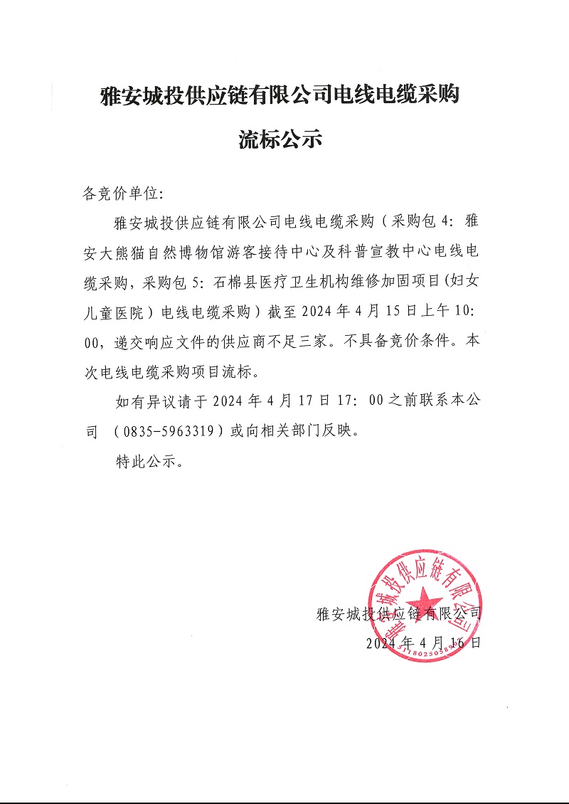 雅安城投供應(yīng)鏈有限公司電線電纜采購流標公示