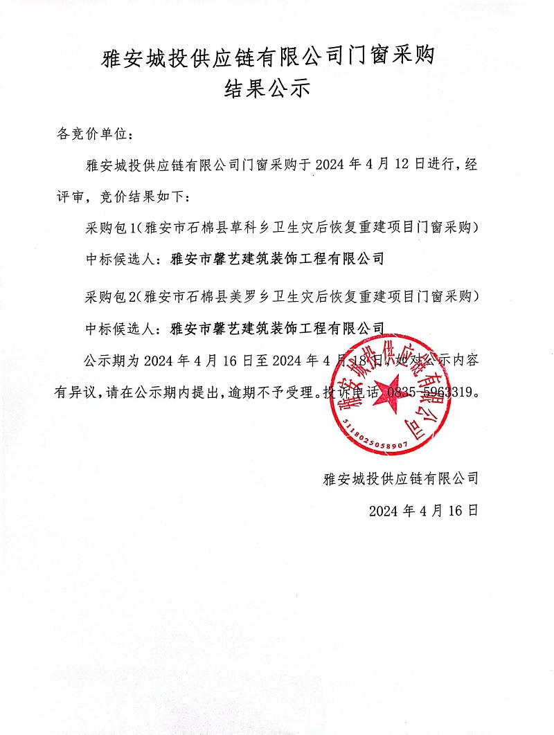雅安城投供應(yīng)鏈有限公司門(mén)窗采購(gòu)結(jié)果公示