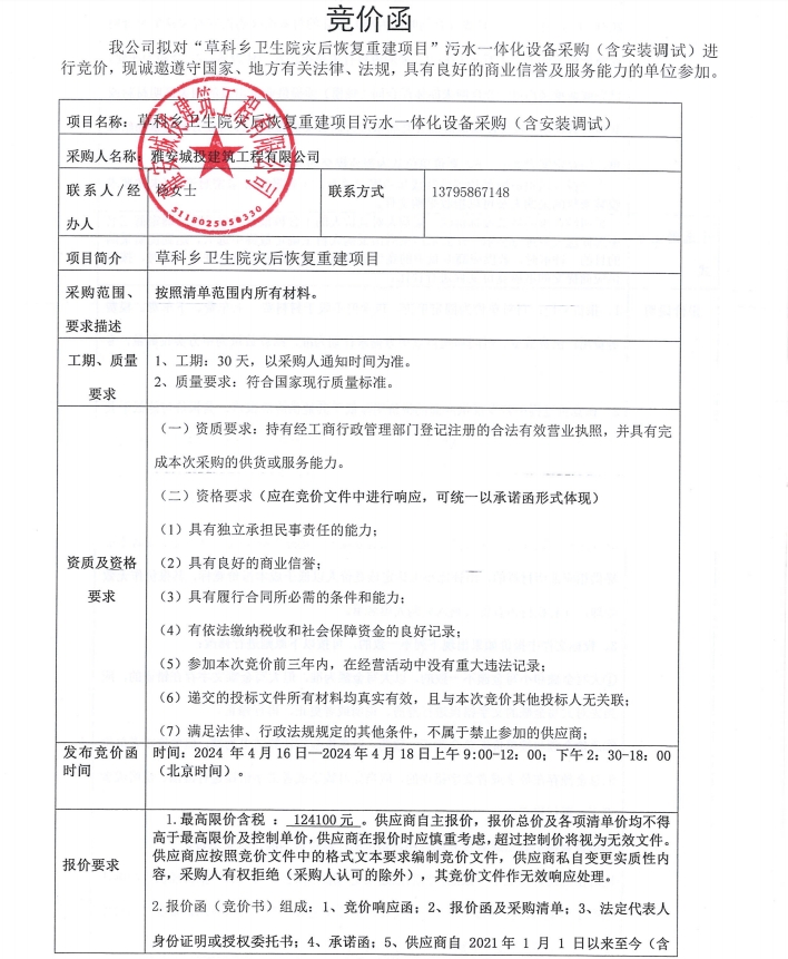草科鄉(xiāng)衛(wèi)生院災(zāi)后恢復(fù)重建項(xiàng)目污水一體化設(shè)備采購(gòu)(含安裝調(diào)試)競(jìng)價(jià)公告