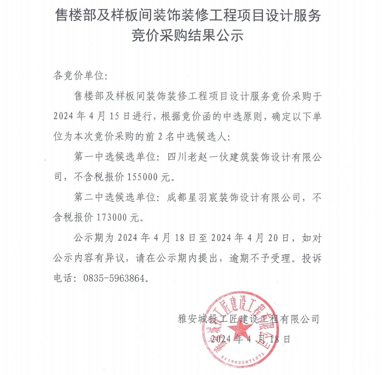 售樓部及樣板間裝飾裝修工程項目設(shè)計服務(wù)競價采購結(jié)果公示