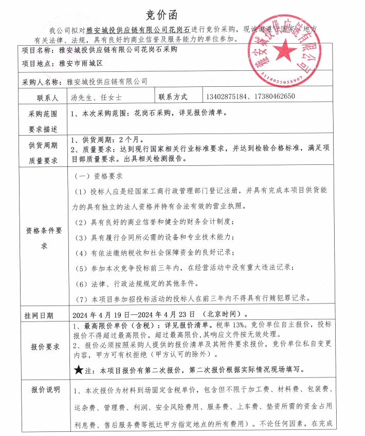 雅安城投供應(yīng)鏈有限公司花崗石采購競(jìng)價(jià)公告