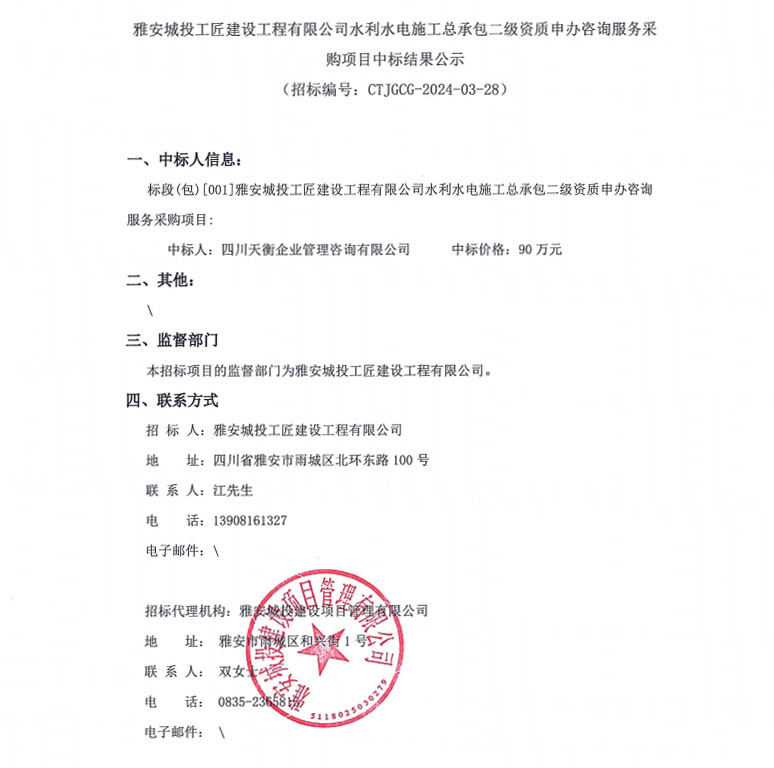 雅安城投工匠建設(shè)工程有限公司水利水電施工總承包二級(jí)資質(zhì)申辦咨詢服務(wù)采購項(xiàng)目中標(biāo)結(jié)果公示