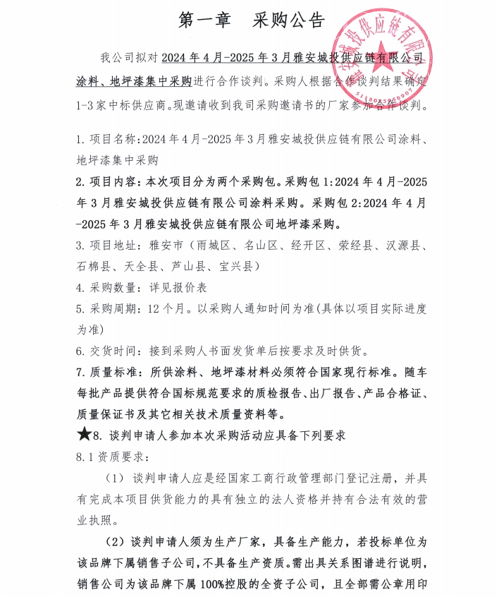 2024年4月-2025年3月雅安城投供應鏈有限公司涂料、地坪漆集中采購公告