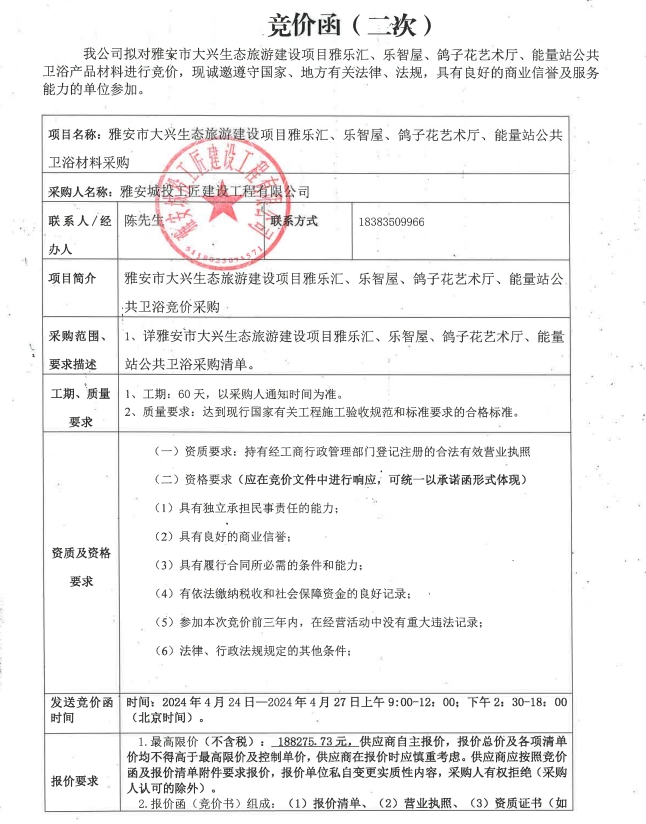 雅安市大興生態(tài)旅游建設項目雅樂匯、樂智屋、鴿子花藝術廳、能量站公共衛(wèi)浴材料采購(第二次)競價公告