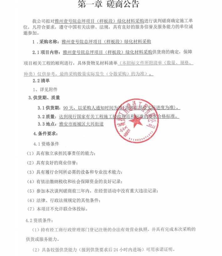 雅州壹號(hào)院總坪項(xiàng)目(樣板段)綠化材料采購(gòu)談判磋商公告