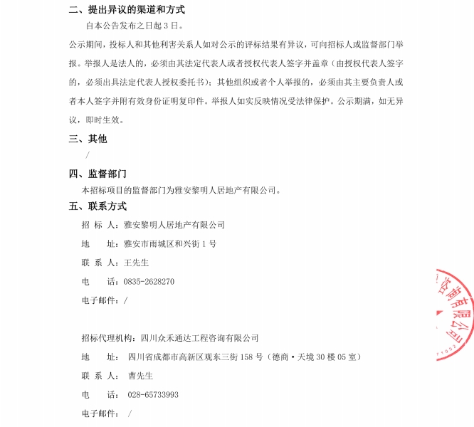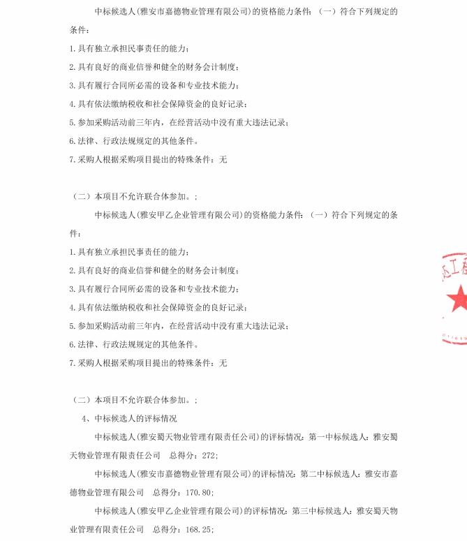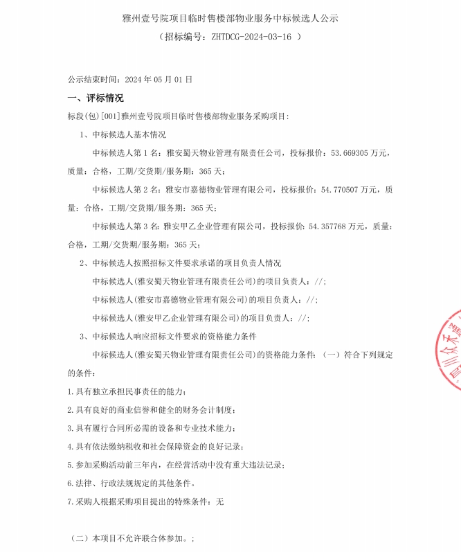 雅州壹號院臨時售樓部物業(yè)服務(wù)中標候選人公示