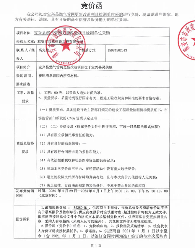 寶興縣燃氣管網更新改造項目檢測單位采購競價公告