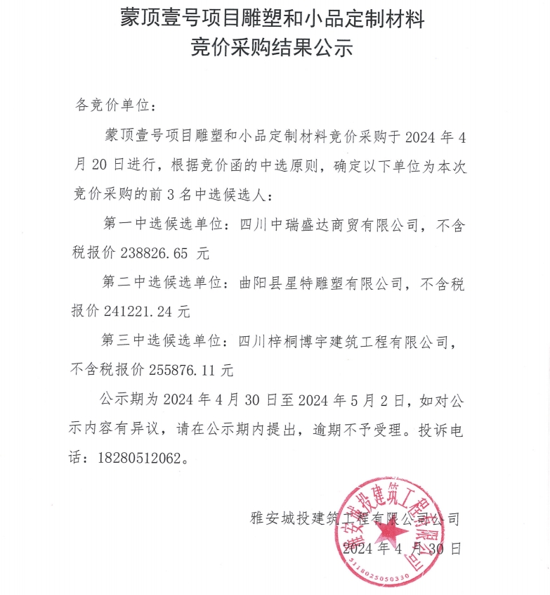 蒙頂壹號項目雕塑和小品定制材料競價采購結(jié)果公示