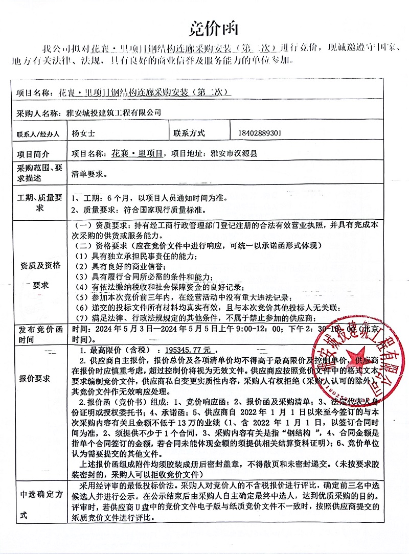 花襄·里項(xiàng)目鋼結(jié)構(gòu)連廊采購安裝(第二次)競(jìng)價(jià)公告