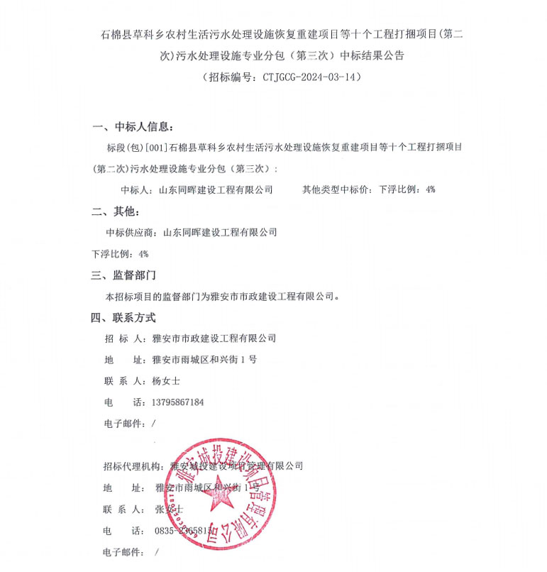 石棉縣草科鄉(xiāng)農(nóng)村生活污水處理設施恢復重建項目等十個工程打捆項目(第二次)污水處理設施專業(yè)分包(第三次)中標結果公告