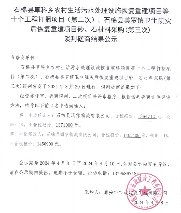石棉縣草科鄉(xiāng)農(nóng)村生活污水處理設(shè)施恢復(fù)重建項(xiàng)目等十個(gè)工程打捆項(xiàng)目(第二次)、石棉縣美羅鎮(zhèn)衛(wèi)生院災(zāi)后恢復(fù)重建項(xiàng)目砂、石材料采購(gòu)(第三次)談判磋商結(jié)果公示
