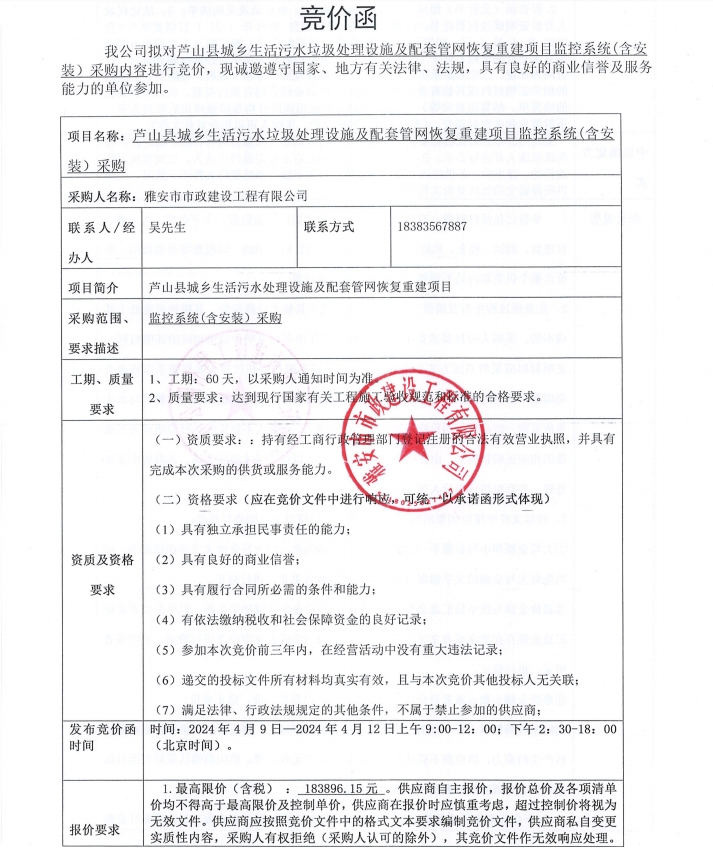 蘆山縣城鄉(xiāng)生活污水垃圾處理設(shè)施及配套管網(wǎng)恢復重建項目監(jiān)控系統(tǒng)(含安裝)采購內(nèi)容競價公告