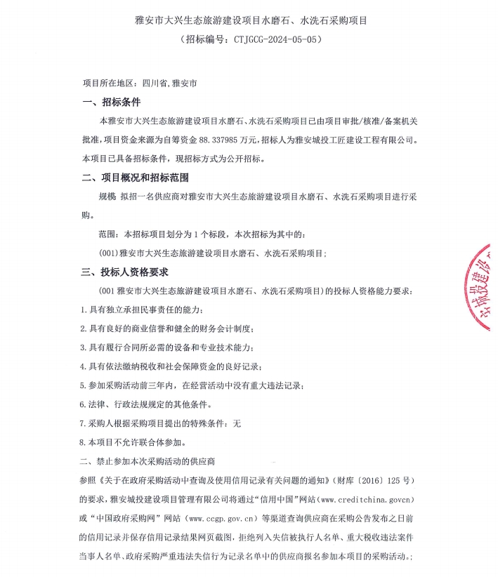 雅安市大興生態(tài)旅游建設(shè)項目水磨石、水洗石采購項目公告