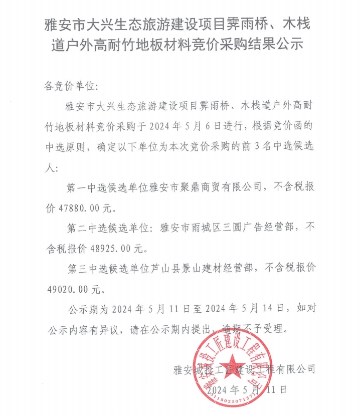 雅安市大興生態(tài)旅游建設項目霽雨橋、木棧道戶外高耐竹地板材料競價采購結果公示