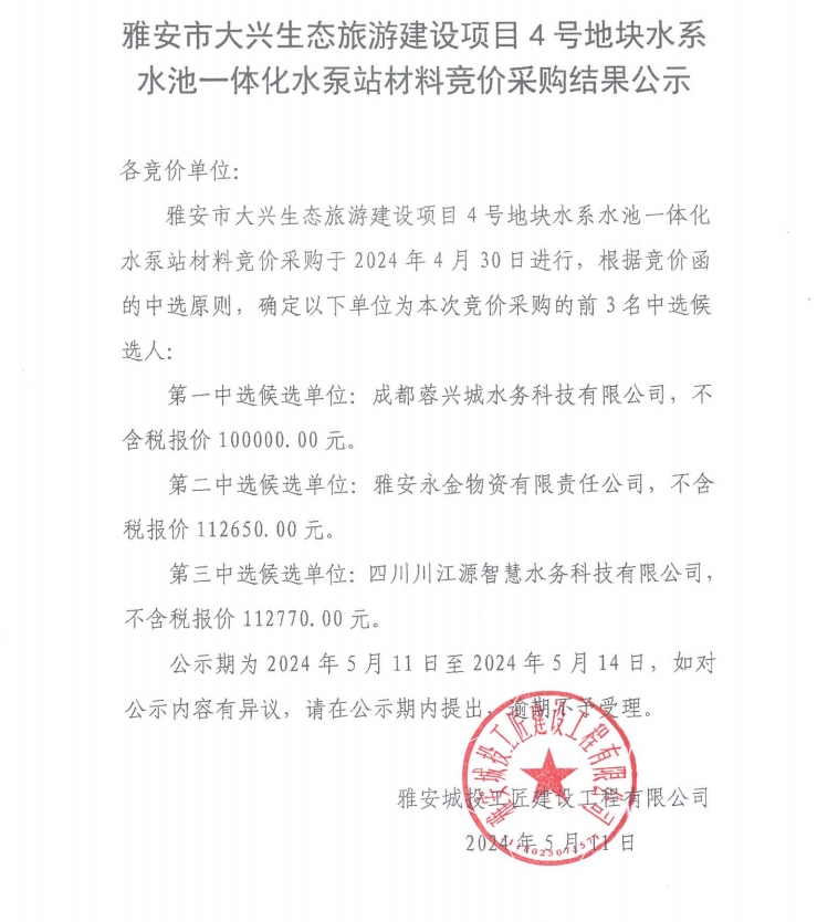雅安市大興生態(tài)旅游建設(shè)項目4號地塊水系水池一體化水泵站材料競價采購結(jié)果公示