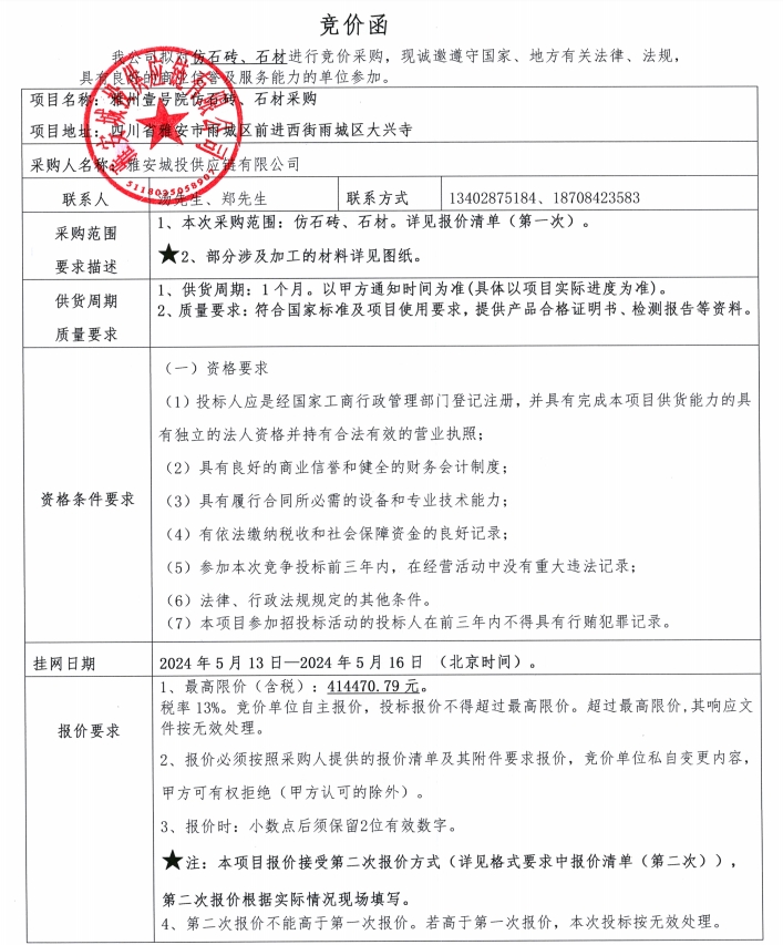 響應文件格式-雅州壹號院仿石磚、石材采購