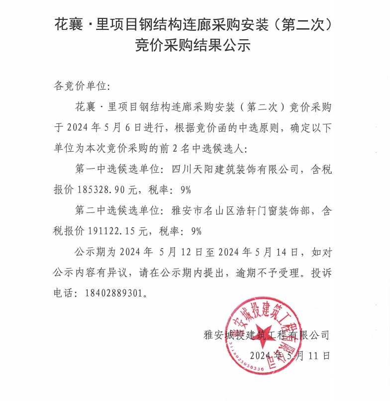 花襄·里項目鋼結(jié)構(gòu)連廊采購安裝(第二次)競價采購結(jié)果公示
