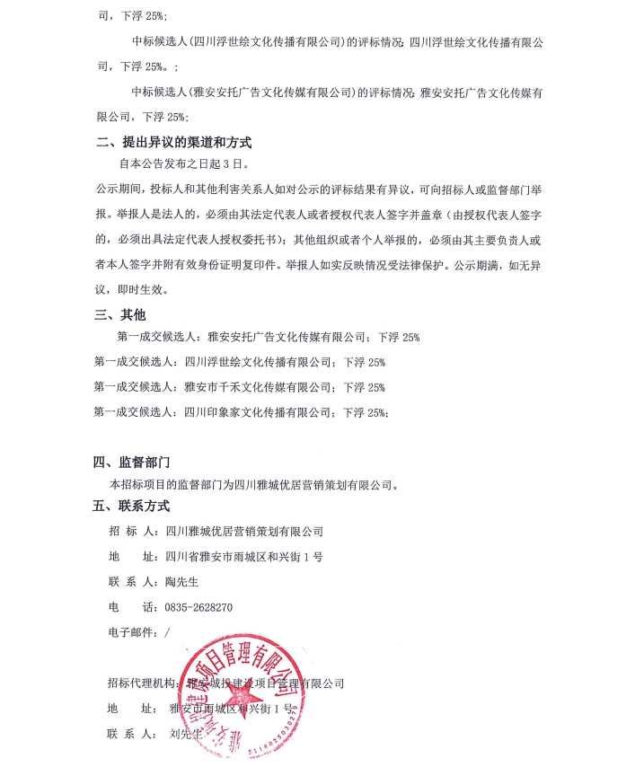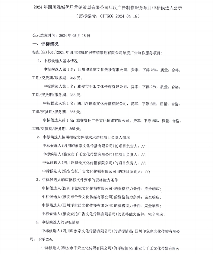 2024年四川雅城優(yōu)居營(yíng)銷(xiāo)策劃有限公司年度廣告制作服務(wù)項(xiàng)目中標(biāo)候選人公示