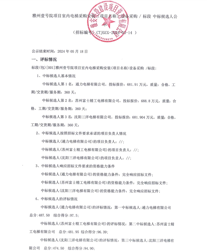 雅州壹號(hào)院項(xiàng)目室內(nèi)電梯采購(gòu)安裝(項(xiàng)目名稱)設(shè)備采購(gòu)/標(biāo)段中標(biāo)候選人公示