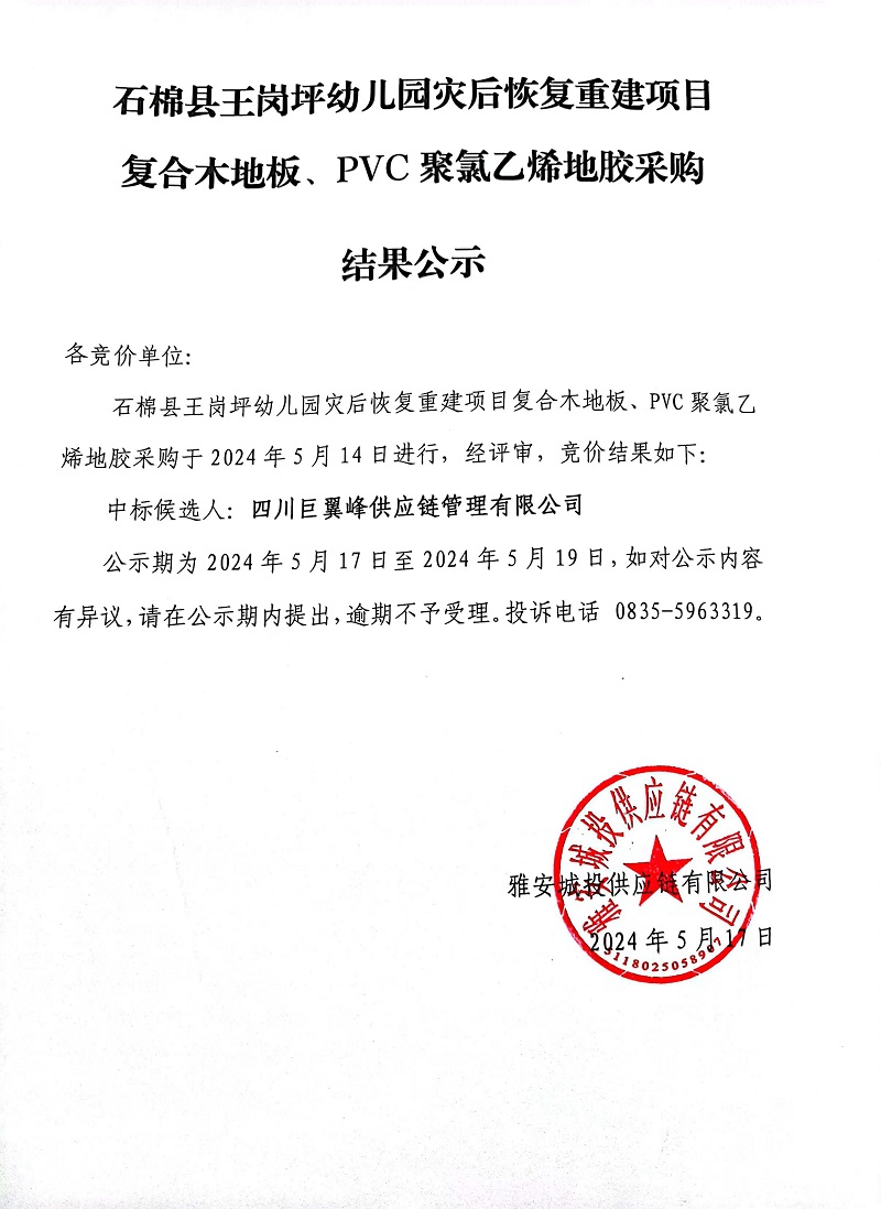 石棉縣王崗坪幼兒園災(zāi)后恢復(fù)重建項目復(fù)合木地板、PVC聚氯乙烯地膠采購結(jié)果公示