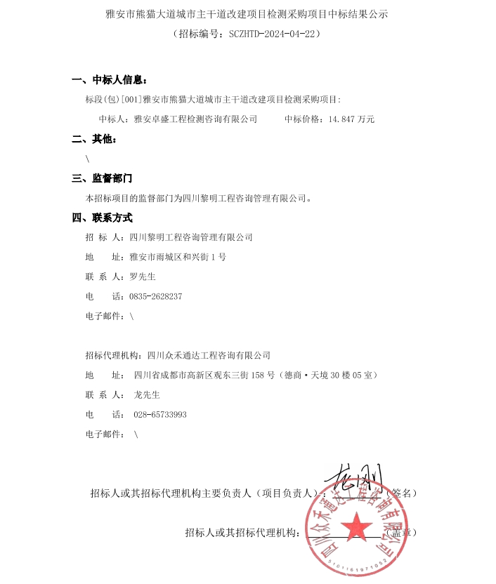 雅安市熊貓大道城市主干道改建項目檢測采購項目中標結果公示