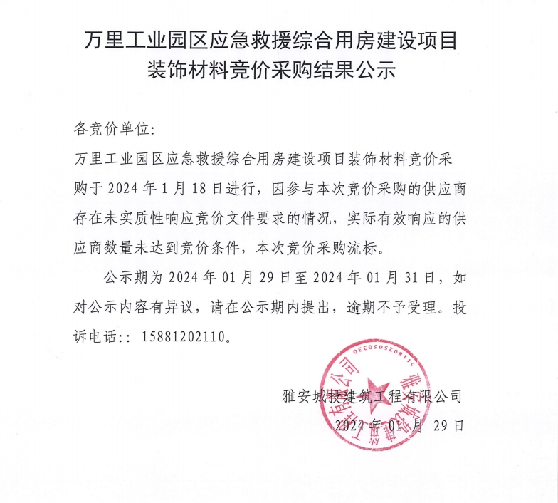 萬里工業(yè)園區(qū)應急救援綜合用房建設項目裝飾材料競價采購結果公示