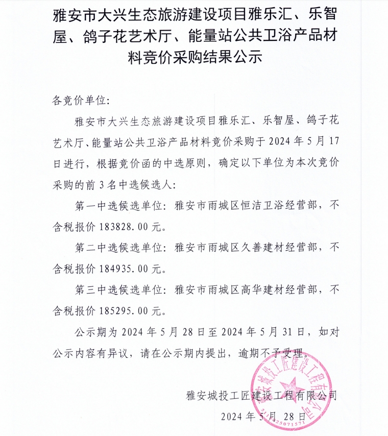 雅安市大興生態(tài)旅游建設(shè)項(xiàng)目雅樂(lè)匯、樂(lè)智屋、鴿子花藝術(shù)廳、能量站公共衛(wèi)浴材料競(jìng)價(jià)采購(gòu)結(jié)果公示
