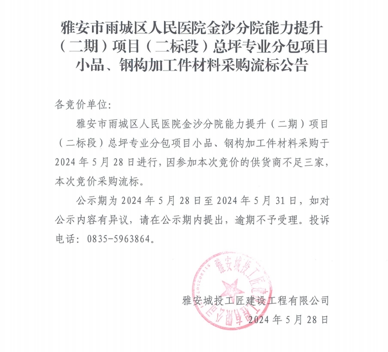 雅安市雨城區(qū)人民醫(yī)院金沙分院能力提升(二期)項(xiàng)目(二標(biāo)段)總坪專業(yè)分包項(xiàng)目小品、鋼構(gòu)加工件材料采購流標(biāo)公告