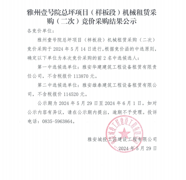 雅州壹號院總坪項目(樣板段)機械租賃采購(二次)競價采購結果公示