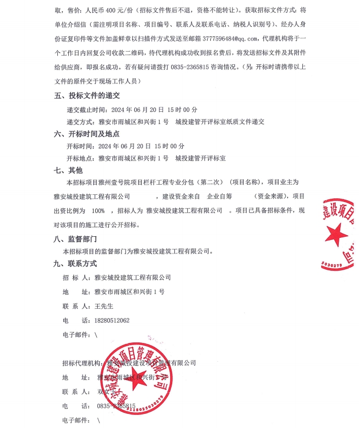 雅州壹號(hào)院項(xiàng)目欄桿工程專業(yè)分包(第二次)公告