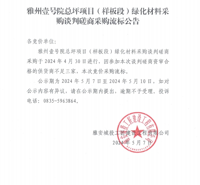雅州壹號(hào)院總坪項(xiàng)目(樣板段)綠化材料采購(gòu)談判磋商采購(gòu)流標(biāo)公告