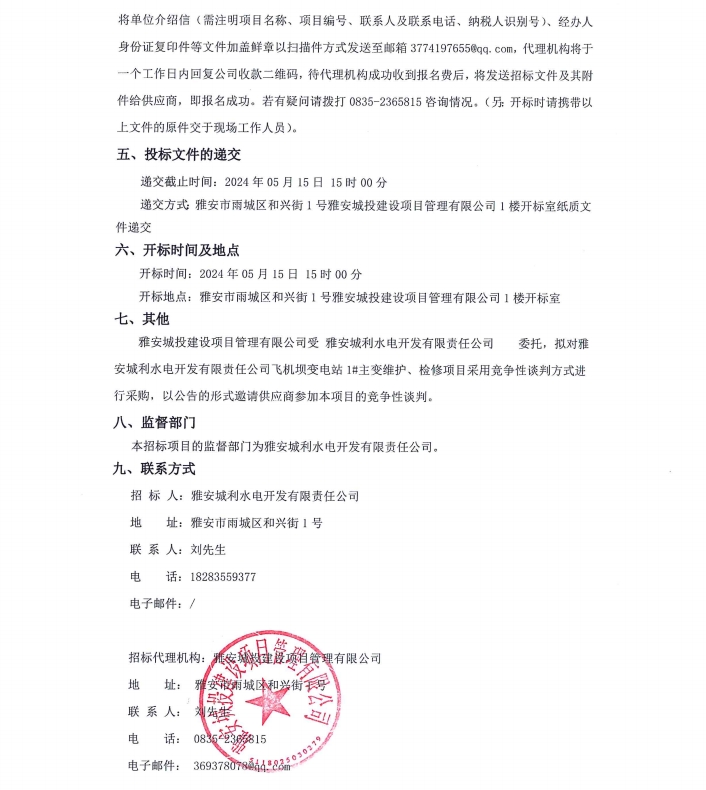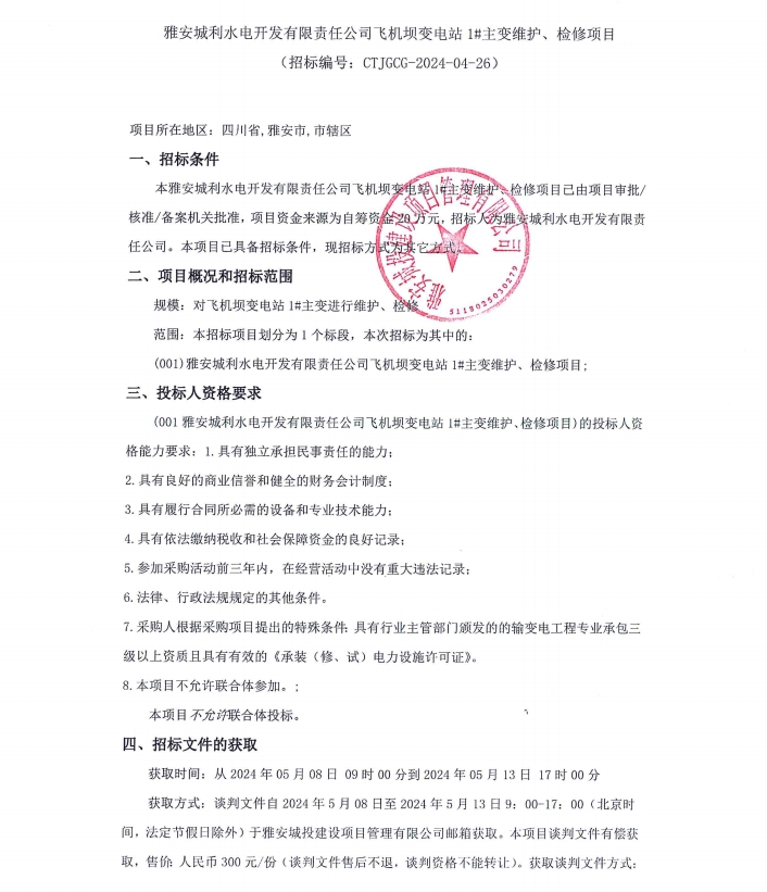 雅安城利水電開發(fā)有限責(zé)任公司飛機(jī)壩變電站1#主變維護(hù)、檢修項(xiàng)目公告