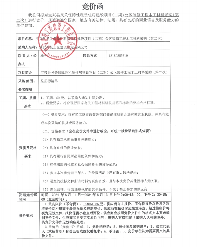寶興縣靈關(guān)保障性租賃住房建設(shè)項(xiàng)目(二期)公區(qū)裝修工程木工材料采購(第二次)競價公告
