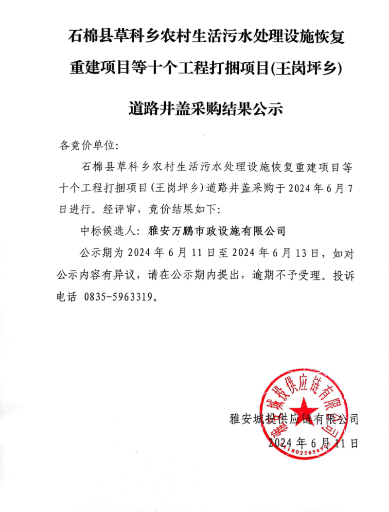 石棉縣草科鄉(xiāng)農(nóng)村生活污水處理設(shè)施恢復(fù)重建項(xiàng)目等十個工程打捆項(xiàng)目(王崗坪鄉(xiāng))道路井蓋采購結(jié)果公示