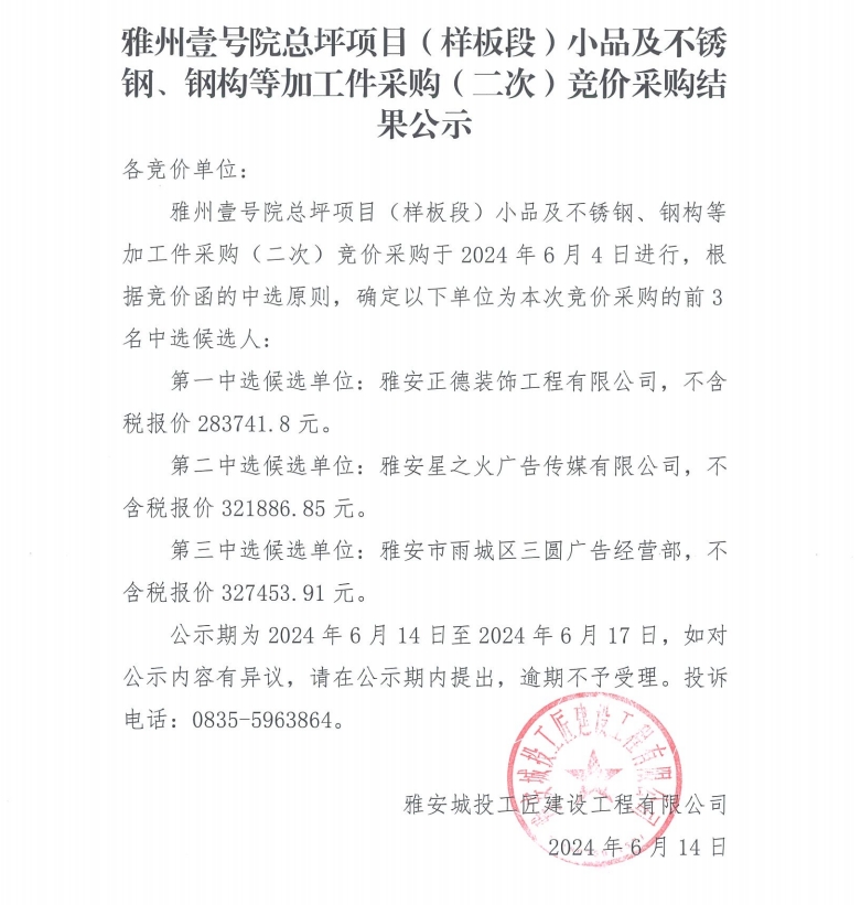 雅州壹號院總坪項(xiàng)目(樣板段)小品及不銹鋼、鋼構(gòu)等加工件采購(二次)競價(jià)采購結(jié)果公示