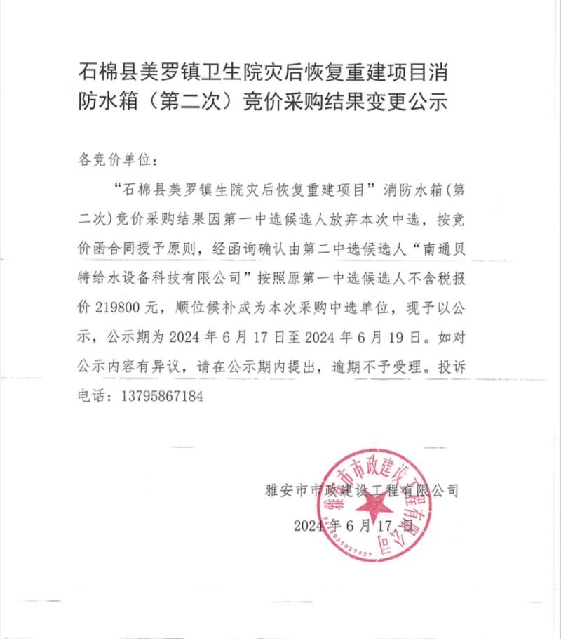 石棉縣美羅鎮(zhèn)衛(wèi)生院災(zāi)后恢復(fù)重建項(xiàng)目消防水箱(第二次)競(jìng)價(jià)采購(gòu)結(jié)果變更公示