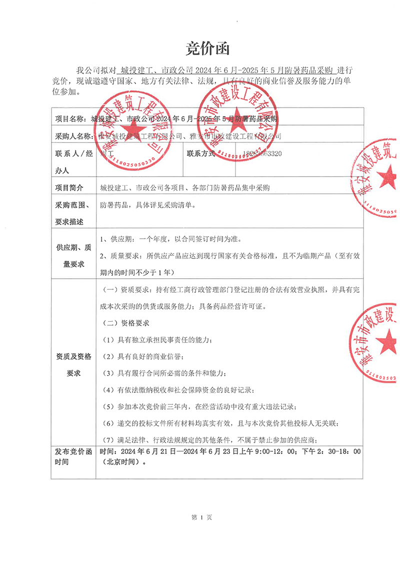城投建工、市政公司2024年6月-2025年5月防暑藥品采購(gòu)競(jìng)價(jià)函