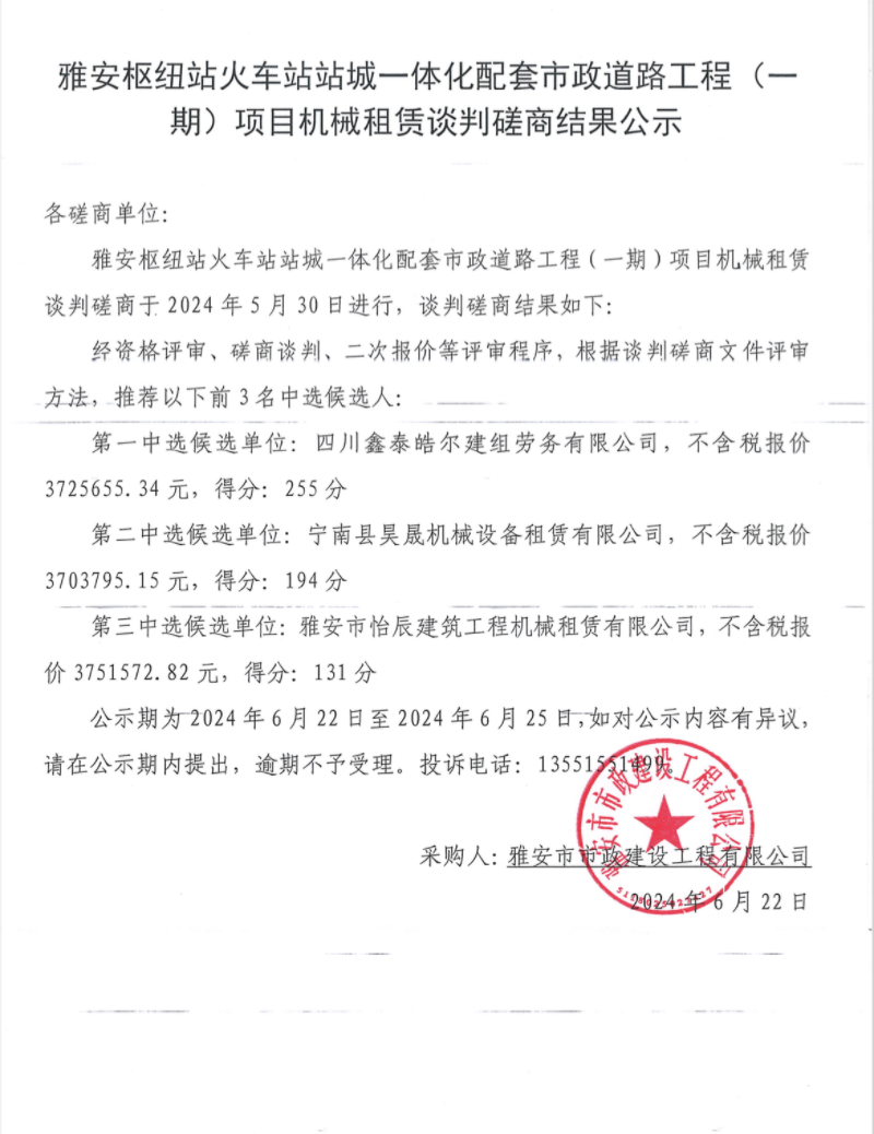 雅安樞紐站火車站站城一體化配套市政道路工程(一期)項目機械租賃談判磋商結(jié)果公示