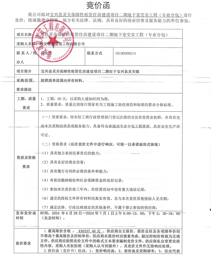 寶興縣靈關(guān)保障性租賃住房建設(shè)項(xiàng)目二期地下室交安工程(專業(yè)分包)競價(jià)公告